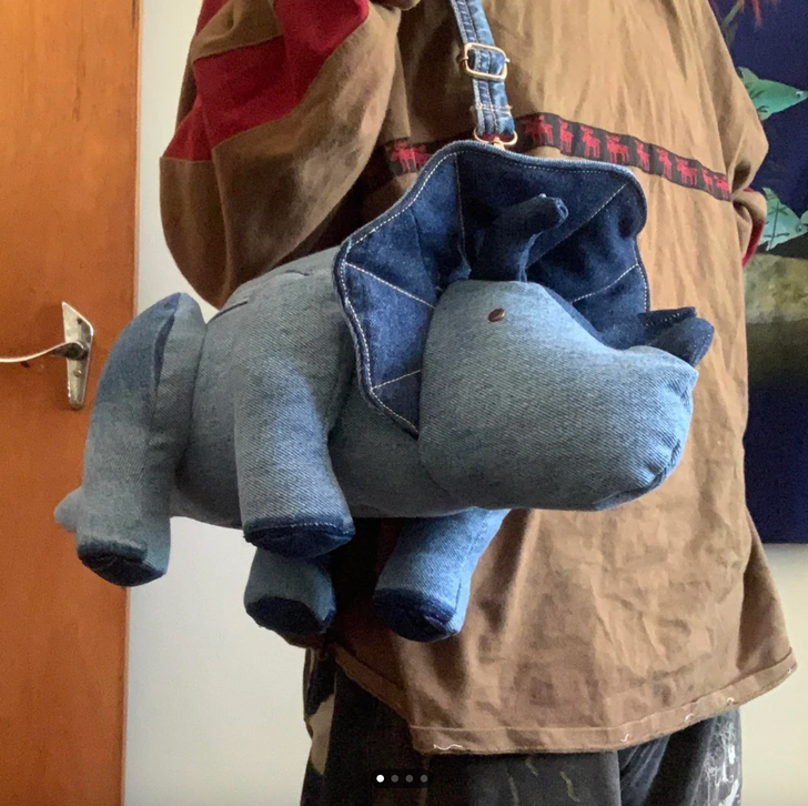 - «Я использовала пояс джинсов для изготовления ремешка и добавила несколько заклепок, чтобы сделать ему глазки. А еще отдельно сделала динозавра». © withgus-to / Reddit