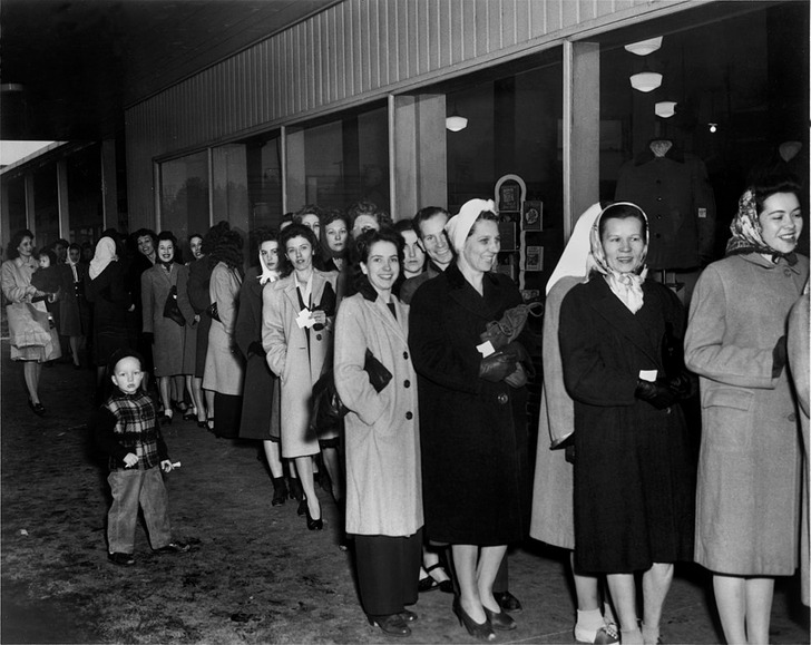 Это одна из очередей в универмаг за нашумевшими нейлоновыми чулками.