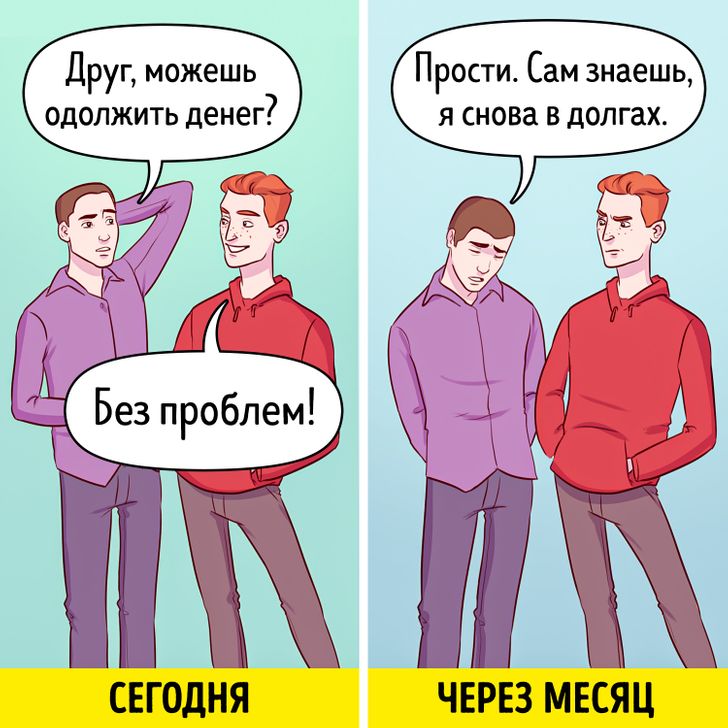 Таким образом, неизбежно вспыхивает взаимная неприязнь, и добрых отношений как не бывало. Поэтому стоит уяснить раз и навсегда: либо не стоит одалживать деньги совсем, либо не поленитесь договориться на берегу, в какие четкие сроки долг будет уплачен.