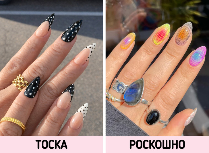 Чтобы такой дизайн выглядел гармонично, выберите связующий элемент — например, общую цветовую палитру. Это могут быть только теплые оттенки. Или пусть это будет какой-то повторяющийся элемент — допустим, детали из серебристого хрома на каждом ногте. Вариантов масса!