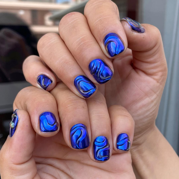 Так что если вы хотите по-настоящему удивить окружающих, попросите мастера использовать два разных геля одновременно. Это создаст эффект «кошачьего глаза», который выглядит куда более футуристично и элегантно, чем просто светящийся в темноте лак.