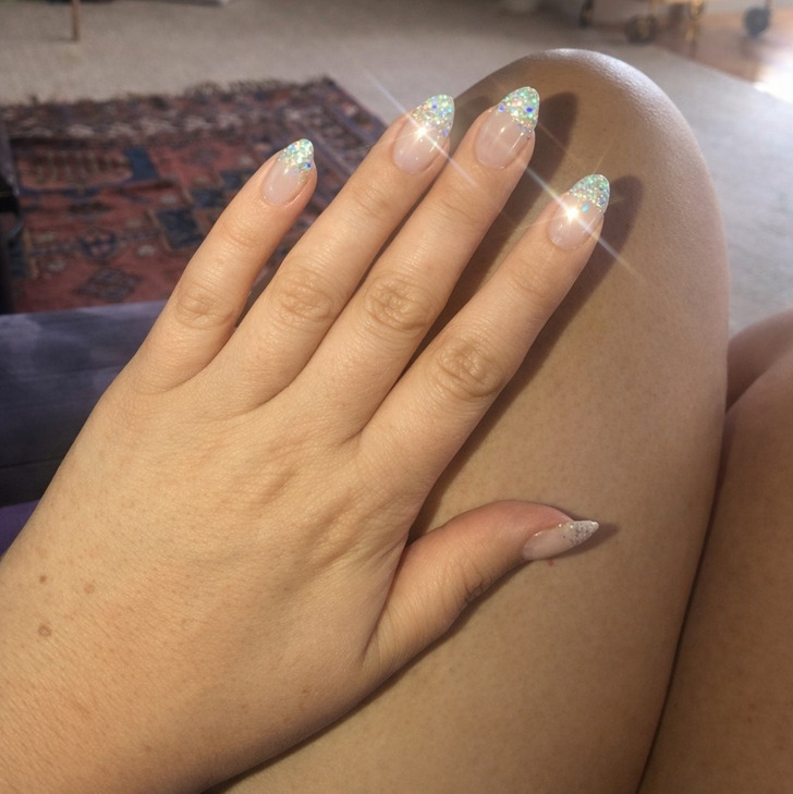 Этот дизайн выглядит по-настоящему магически, будто вы случайно окунули кончики пальцев в бокал, наполненный стразами и драгоценными камнями. Мастера называют такой маникюр «ювелирным» — он оживает и ловит каждый луч света при любом движении рук.