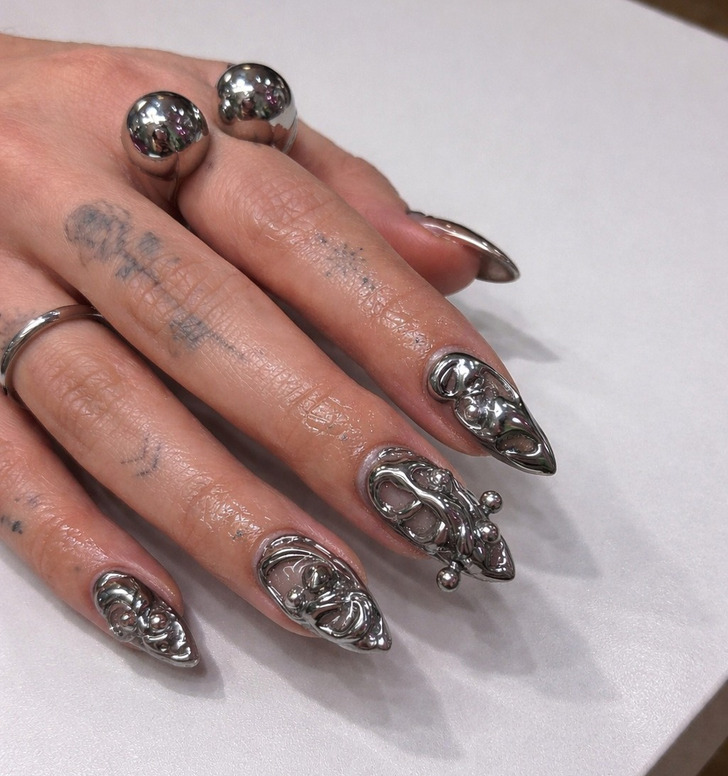Хром не собирается покидать модные чарты, но в 2026 году он станет гораздо скромнее. На смену дерзкому металлическому эффекту приходит более мягкое свечение. Вместо плотного зеркального слоя теперь модно наносить полупрозрачную жемчужную пыльцу, создавая эффект глазури.