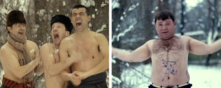 Возможно, гримерам, которые наносили тату на героев, не раскрыли детали сюжета, и они упустили тот факт, что персонажи будут буквально обтираться снегом. Из-за этого нанесенные тату поплыли. Но разве это лишает наш любимый фильм шарма?