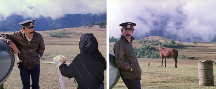 Если присмотреться к фону, можно заметить странную деталь: корова с бочкой то появляется у самолета, то исчезает в следующем кадре. Такое ощущение, будто во время съемок реквизит постоянно переставляли. Из-за этого сцена выглядит немного обрывисто, хотя при обычном просмотре этого почти не видно.