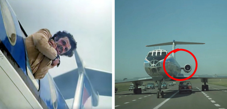 Сцена полета в этом фильме вообще живет по своим правилам физики и логики. Пейзажи за окном самолета меняются так, словно экипаж телепортирует пассажиров между дублями. Но главным сюрпризом становится пассажир, который то торчит из иллюминатора, то нет, а потом — снова торчит.