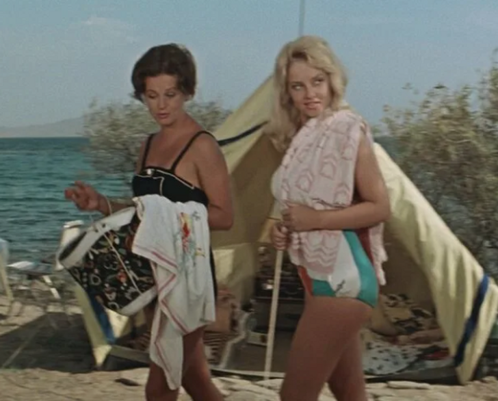 Это, конечно, не киноляп, а скорее небольшой диссонанс в поведении героинь. Они решают игнорировать мужчин, которые отдыхают рядом, но уже в следующем кадре выходят на пляж при полном параде. Смотрится это довольно забавно.
