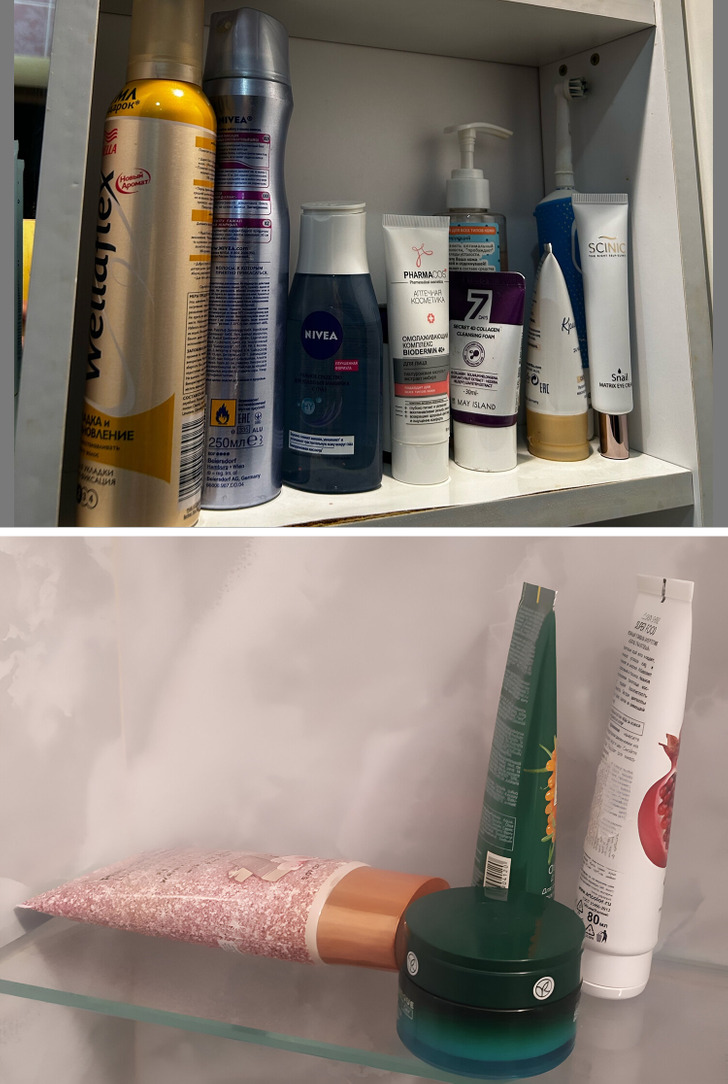 В отелях никто не держит столько средств, сколько дома в ванной. Помимо косметики там еще и ассортимент постирочной. Поэтому пример некорректный.