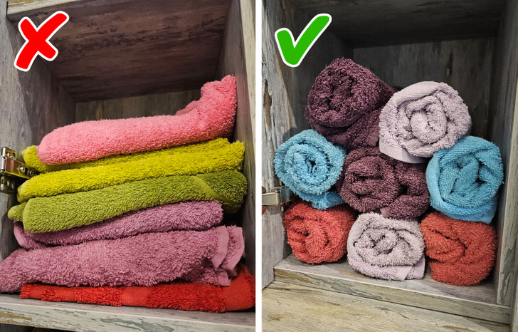 Каждый раз при виде аккуратно свернутых полотенец в отеле внутри просыпается чуть ли не детский восторг. Почему бы с абсолютно взрослой прагматичностью не повторить это дома? Белые или цветные, эти милые «рулетики» добавляют ощущения чистоты и уюта. Да и места занимают гораздо меньше квадратных «конвертов», в которые мы привыкли складывать с детства.