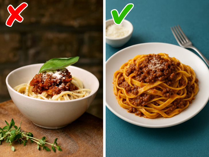 Это одно из самых больших заблуждений, касающихся итальянской кухни. С соусом, точнее, как называют его сами итальянцы, рагу, подаются другие виды пасты. Дело в том, что ragu alla bolognese — блюдо с севера Италии, а спагетти — с юга. Именно поэтому классический рецепт этого кушанья подают с пастой, характерной для северных регионов — как правило, это тальятелле. Поверхность у этой пасты шершавая, что дает соусу возможность цепляться за нее и не стекать.