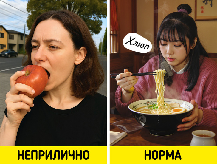 У японцев — свое представление о том, что считается приличным за столом, а что — нет. Например, если во время еды кусочек пищи падает на стол или в тарелку, подхватывать его руками считается невежливым. Неприличным выглядит и тот момент, когда мы откусываем большие куски. Скажем, есть яблоко целиком, да еще и неочищенное, откусывая прямо от него, — верх неприличия. А вот есть суп, к примеру рамен, хлюпая — абсолютная норма.