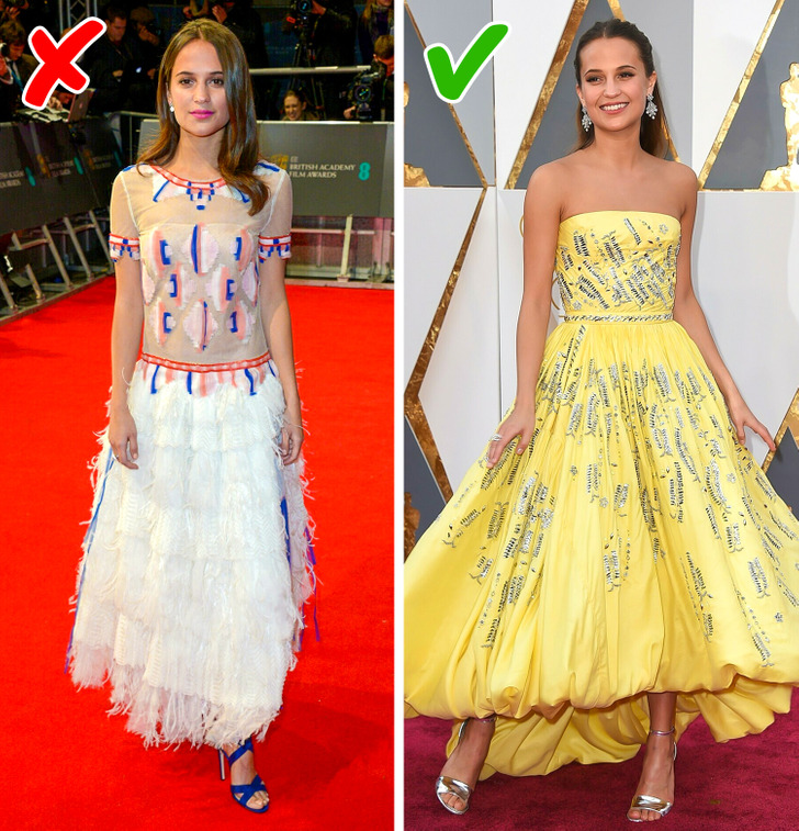 Алисия Викандер, имеющая от природы длинное туловище, давно научилась корректировать особенность своего тела с помощью правильно подобранной одежды. Платье с завышенной линией талии (справа) визуально удлинило ноги и сбалансировало пропорции тела.