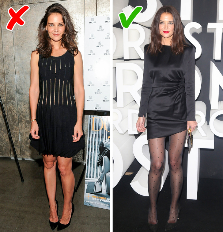 Кэти Холмс — одна из самых стильных звезд Голливуда. И даже неидеальные ноги не мешают актрисе выгодно преподносить свою фигуру. Как мы видим, всего лишь акцент на талии и черные колготки могут творить настоящие чудеса.