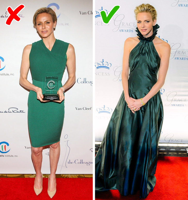 В прошлом профессиональная пловчиха, а ныне княгиня Монако Шарлен — обладательница мускулистых плеч и узких бедер. Выгодно преподносить свою фигуру супруге князя Монако помогает одежда подходящих фасонов, например пышные юбки и воротник халтер.