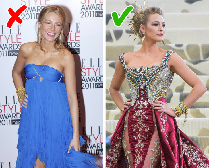 У Блейк Лайвли потрясающие ноги, однако актриса не может похвастаться осиной талией. И если в начале карьеры супруга Райана Рейнольдса по неопытности выбирала платья свободного прямого кроя, подчеркивающие ее маленькую особенность, то со временем она начала отдавать предпочтение облегающим туалетам с корсетным кроем и дополнительной юбкой. Такие модели платьев имитируют фигуру «песочные часы», выгодно подчеркивают талию и придают бедрам желанный объем благодаря грамотной драпировке.