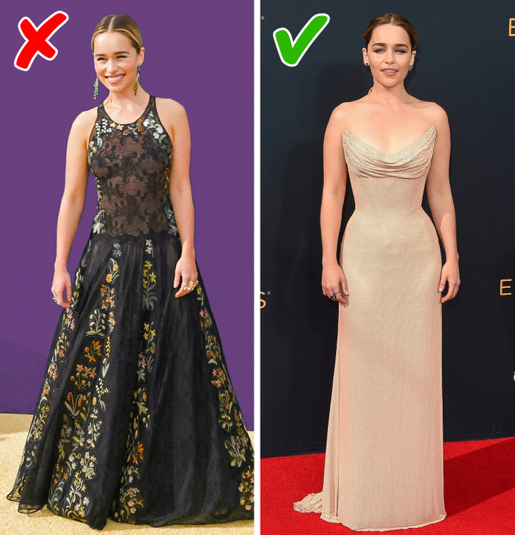 Эмилия Кларк при росте 157,5 см умудряется выглядеть выше с помощью правильно подобранной одежды. Платье с заниженной линией талии (слева) сыграло с актрисой злую шутку, украв у нее несколько сантиметров роста. А вот туалет на фото справа, наоборот, удлинил силуэт благодаря правильной высоте лифа и телесному цвету.