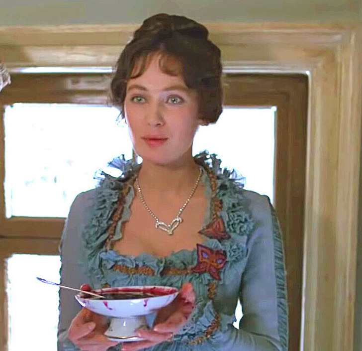 В отличие от корыстной маменьки, Лариса Огудалова — барышня романтичная и все еще питающая иллюзии. Поэтому в фильме она носит преимущественно платья в голубых цветах. Наряд, в котором она появляется на своих именинах, выполнен именно в этой гамме. Причем модное по тем временам декольте в форме каре украшают не только пышные рюши, но и символичные бабочки. Лариса, ровно как и эти красивые, но недолговечные создания, стремится к тому, что в результате ее погубит.