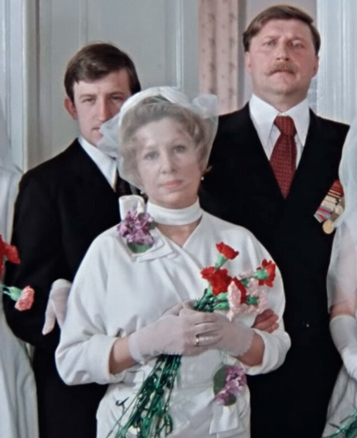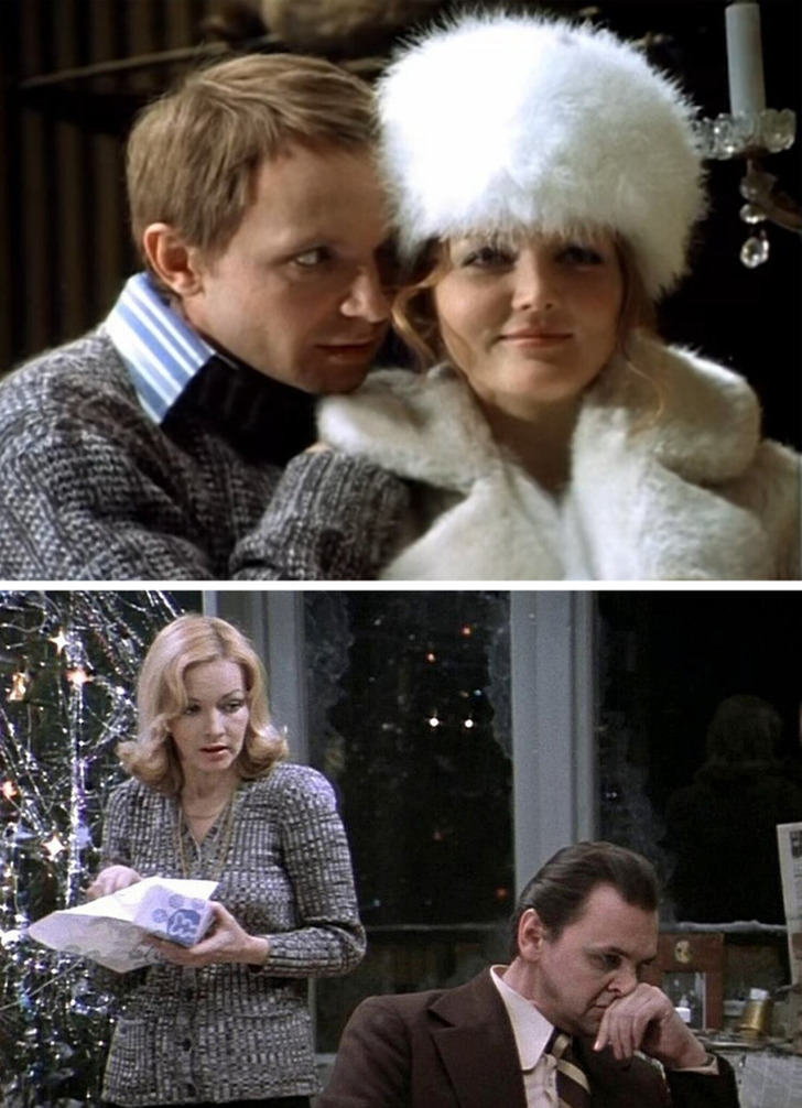 Когда мы видим Женю Лукашина рядом с его невестой Галей, он одет в неприметный серый свитер и выглядит немного по-детски и беззащитно. Надя Шевелева тоже появляется в кадре с избранником в блеклой серой кофточке. Как будто режиссер решил намекнуть, что и Галя, и Ипполит не вызывают у главных героев сильных чувств, и они лишь мирятся с присутствием этих людей в своей жизни. Зато, оказавшись наедине друг с другом, Надя и Лукашин преображаются. Она щеголяет в стильном платье, а он носит черную водолазку и хорошо сидящий костюм.