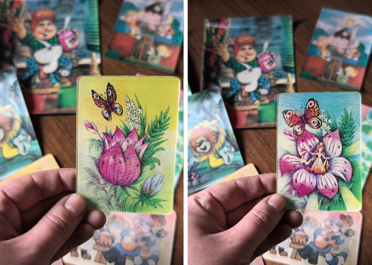 А еще до появления фишек POG и тамагочи человек, обладающий переливными календариками, считался настоящим счастливчиком. Помните такие? Поворачиваешь его, и изображение меняется. Наряду с ними популярностью пользовались еще и стерео-открытки. Они, конечно, были не настолько динамичны, но меня так интриговало, что же там внутри... В общем, как-то я выбрала самую нелюбимую с ковром-самолетом и разрезала ее... Увы, там не было ничего особенного, а вот печальные глаза мама запомнились надолго.