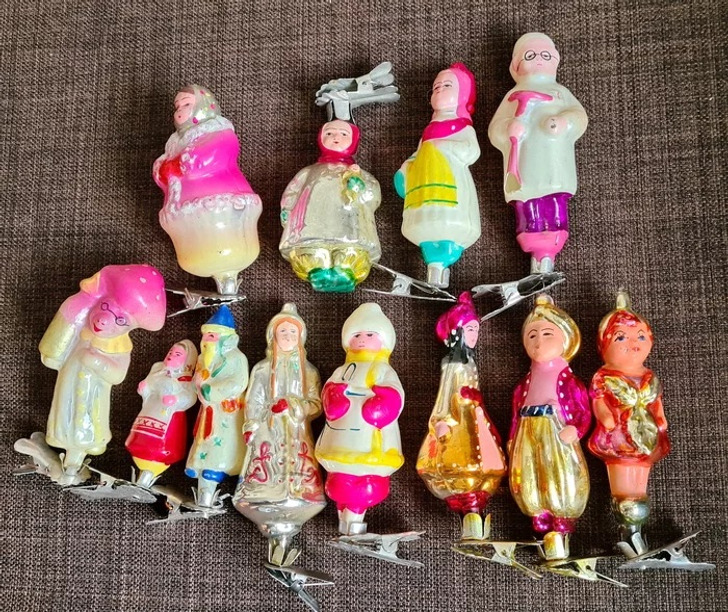 И гвоздь программы сервантных историй — елочные игрушки. Они могли стоять в коробке из-под елки на шкафу или лежать на антресоли. Пожалуй, у каждого из нас сохранилась игрушка с тех самых времен, несмотря на всю хрупкость. А, возможно, кто-то найдет у себя и плоские игрушки — тисненые, состоящие из двух склеенных половинок. Тематика была разнообразной: от милых сосулек и животных до тематических коллекций, посвященных чему-то важному, например, полету в космос. А благодаря кинофильму «Карнавальная ночь» начали появляться игрушки в форме часов со стрелками на без пяти минут двенадцать.