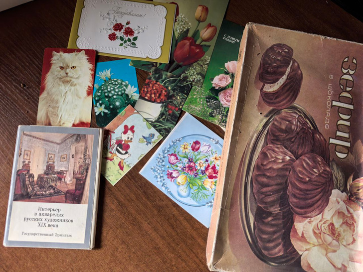 Еще в сервантах хранились коллекции. Люди собирали марки, открытки, значки. Последние моя коллега бережно крепила к льняному полотенцу и укладывала его в большую салатницу. Многие собирали и календарики. Прямо в коробки от зефира или конфет. Заметим, уже тогда котики были в моде.
