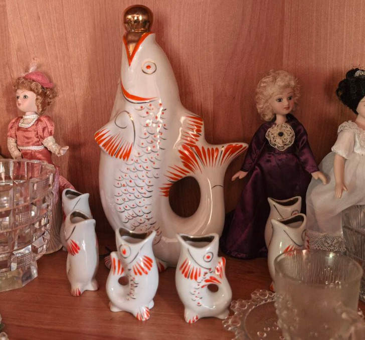 Эта дружная семья рыбок обитала почти в каждом доме. Но чаще всего сервиз просто стоял не у дел: из-за своей необычной формы рыбы были крайне неудобны в использовании. Создал этот шедевр грузинский художник Барамидзе Абисалому. А рыбки заимствованы из японской графики. Первый экземпляр «Карповой семьи» (и да, это карпы!) был выполнен в бело-золотом ключе. Позже различные заводы добавляли своих красок.