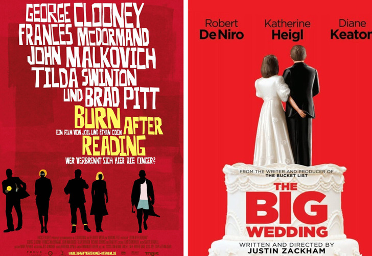 - В коллаже — постеры к фильмам «После прочтения сжечь» (2008); «Большая свадьба» (2013).