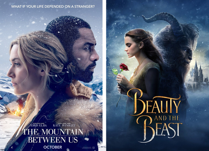 - В коллаже — постеры к фильмам: «Между нами горы» (2017); «Красавица и чудовище» (2017).