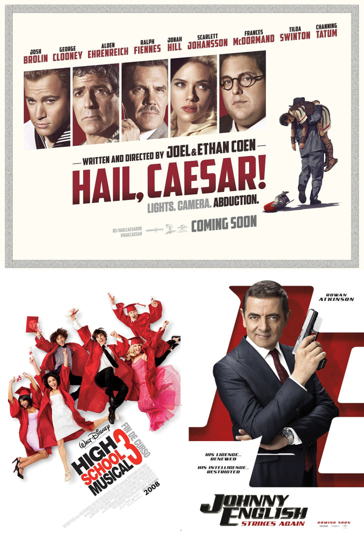 В коллаже — постеры к фильмам «Да здравствует Цезарь!» (2016); «Классный мюзикл: Выпускной» (2008); «Агент Джонни Инглиш 3.0» (2018).