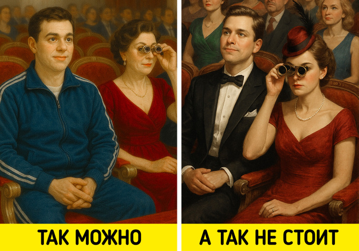 У многих из нас театр ассоциируется с вечерними нарядами, высокими прическами, жемчугом на шеях прекрасных дам и винтажными запонками в манжетах мужских рубашек. И если вы хотите нарядиться так на спектакль — это чудесно! Но в современных реалиях действительно считается нормой прийти в театр в джинсах, спортивном костюме, кроссовках. Главное, чтобы вам было комфортно. Многие эксперты театрального этикета лишь советуют помнить, что в залах может быть прохладно.