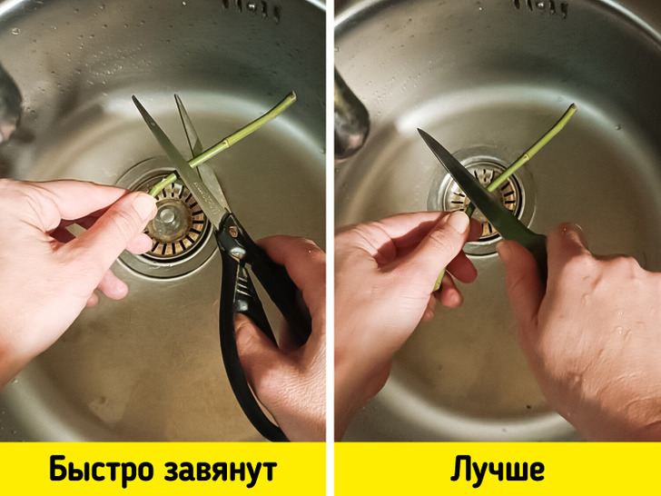 Руководитель цветочной компании Кристина Штембель советует обрезать цветы под струей теплой воды. Так растения быстрее получат столь необходимую им жидкость. Главное, чтобы она была не слишком горячей.