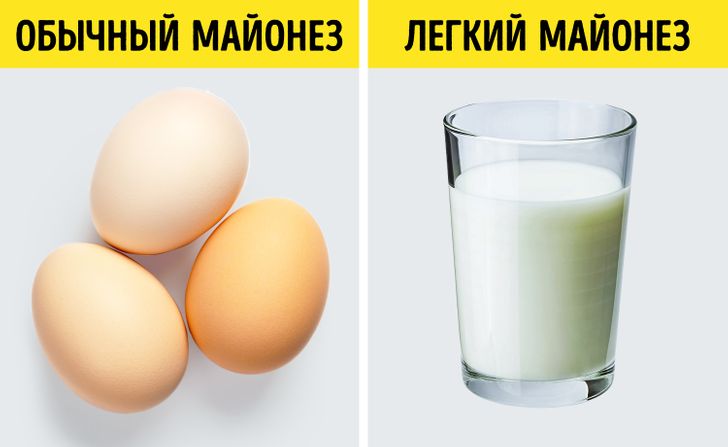 Все знают, что майонез — это не лучший выбор для тех, кто хочет сохранить стройную фигуру. Однако существует способ сделать его более легким: для этого достаточно заменить яйца обычным молоком. Возьмите ваш любимый рецепт домашнего майонеза и добавьте вместо яиц молоко — его количество должно быть в 2 раза меньше, чем количество масла. Так вы получите не менее вкусный, но гораздо более полезный соус.