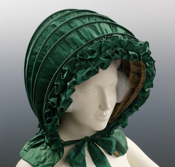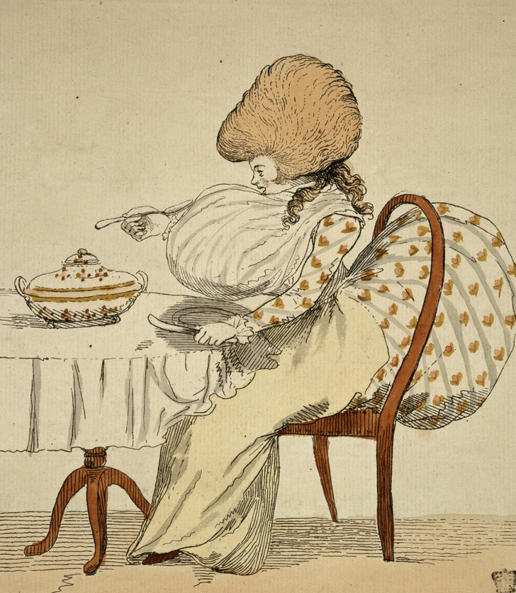 В конце XVIII века дамы носили высокие, пышные прически. На создание этих затейливых конструкций уходило немало времени: парикмахеры подкручивали локоны и зачесывали их на подушечку, скрепляя шпильками и посыпая пудрой. После этого волосы украшали искусственными листьями, цветами или фруктами. Создавать такую красоту каждый день было непросто, а потому барышни изо всех сил старались сохранить ее. На улицу они выходили исключительно в калашах — больших складных капюшонах, которые представляли собой каркас с натянутой на него тканью.
