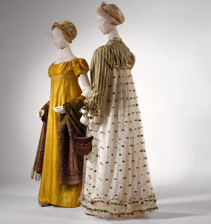 На рубеже XVIII и XIX веков в моде был женский силуэт с пышными бедрами и грудью. Чтобы придать своему бюсту дополнительный объем, барышни использовали косынки из хлопка, льна или газа. Ткань свободно накидывалась на грудь, перекрещивалась и завязывалась на спине.