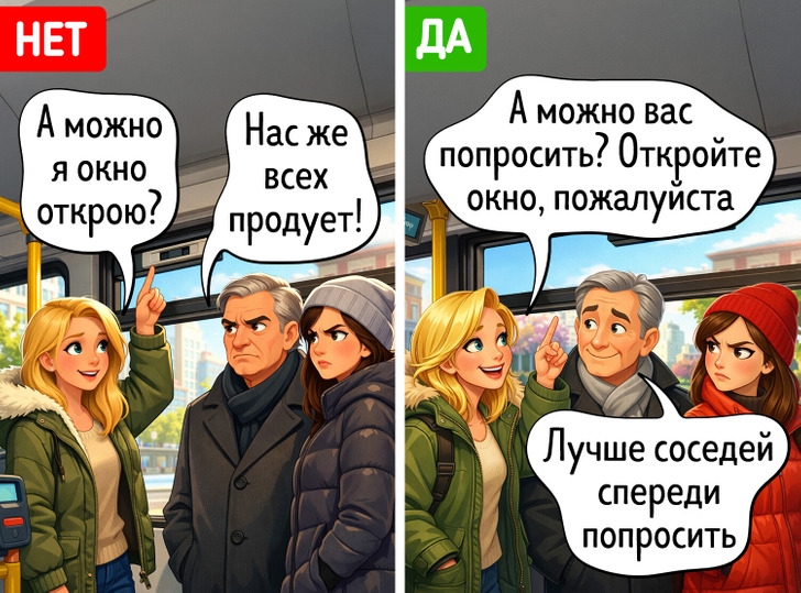 В забитом транспорте глоток свежего воздуха бывает на вес золота. Но далеко не все пассажиры радуются, когда их попутчик открывает окно рядом с собой. Можно, конечно, спросить мнение всех людей вокруг, но по правилам этикета делать это не обязательно. Другое дело, что форточка, расположенная над сиденьем, не обеспечит человеку доступа к свежему воздуху, а вот пассажиры позади него будут наслаждаться легким ветерком. Так что уж лучше сразу попросить попутчиков спереди открыть окно. Хоть будет толк от этих обсуждений.