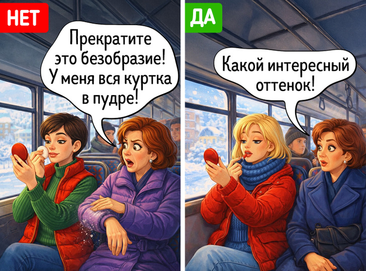 Долгое время считалось, что автобус или метро — это не то место, где можно краситься. Но давайте признаем: нет ничего плохого в том, чтобы утром поспать на 15 минут подольше, а потом быстро нанести помаду и подкрасить брови по дороге на работу. Эти простые ритуалы не помешают другим пассажирам, хотя некоторые и могут одарить вас неодобрительными взглядами. В идеале не стоит пользоваться косметикой с сильными ароматами, чтобы кто-то из попутчиков не расчихался. Ну и по возможности стоит избегать пудры, так как от сквозняка она может распылиться на сидящих рядом пассажиров — это может вызвать дискомфорт.