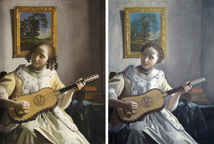 Красная краска для прорисовки губ, скорее всего, прибыла из Латинской Америки, а темно-синие пигменты были получены из азиатского индиго. В те времена все эти материалы можно было добыть в нидерландских портах, но стоили они недешево. То же исследование показало, что в качестве фона художник изначально использовал темно-зеленую драпировку, а у неизвестной девушки были прорисованы длинные ресницы.