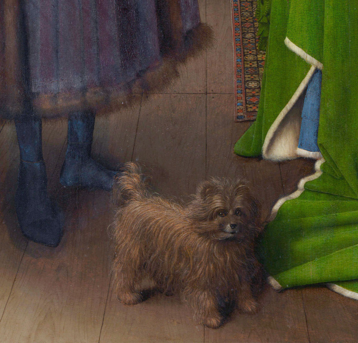 Исследователи до сих пор спорят об истинном смысле известного портрета: был ли он изображением свадьбы или данью памяти безвременно ушедшей женщины. На картине все время находились детали, которые подтверждали и первую, и вторую версию. Предметом особенно ожесточенных споров стала милая собачка, стоящая у ног женщины.