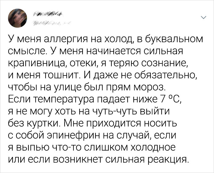 Аллергия на холод - это актуально (((Я умираю, когда температура падает ниже +15. У меня страдает всё : лицо, руки, спина, ноги... В общем, это кошмар, никому не пожелаю)