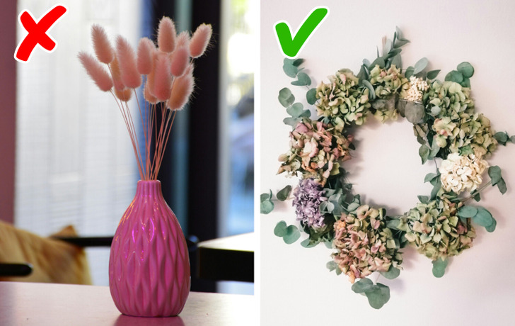 Проблема сухих и искуственных цветов - это пылесборники, но их двух картинок я б оставила розовые слева.