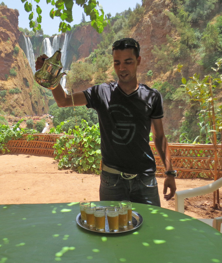 Марокканское чаепитие — это настоящее театрализованное представление. Хозяин заваривает мятный чай в чайнике, а затем начинает разливать его в небольшие стеклянные стаканчики. Но делает он это особым образом: поднимая чайник высоко над стаканами, создавая длинную, непрерывную струю. Во-первых, это красиво. Во-вторых, чай насыщается кислородом, что делает его вкус более легким и освежающим, а также позволяет ему немного остыть.