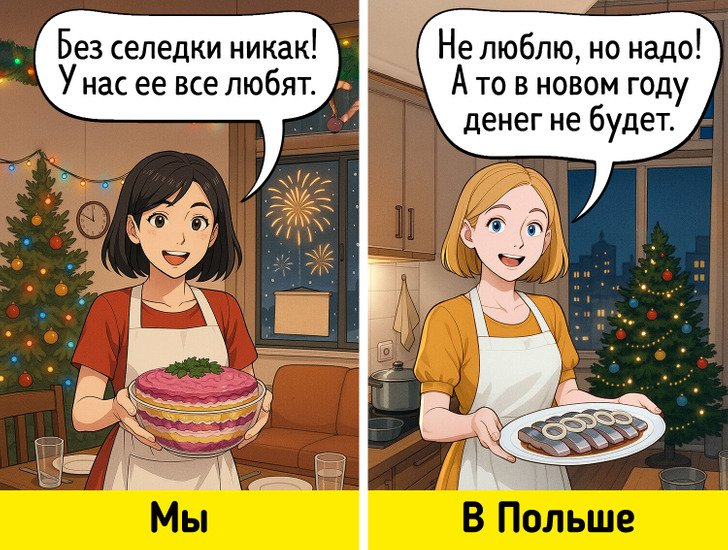 В Польше на новогоднем столе обязательно присутствует маринованная или соленая селедочка. Эта серебристая рыбка — не просто вкусная закуска. Ее форма и цвет ассоциируются с монетами, а потому она считается мощным атрибутом, привлекающим финансовое благополучие в наступающем году. Отведать селедки в канун Нового года символизирует надежду на то, что кошелек в будущем году будет полным.