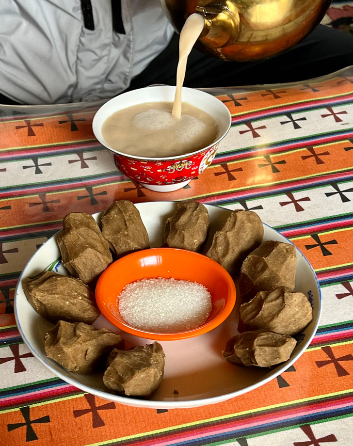 Дорогому гостю в Тибете первым делом подадут чашку соленого чая с маслом яка. Хозяйка или хозяин наливает чай и подает гостю обеими руками — жест, демонстрирующий полное внимание и уважение. Гость, в свою очередь, должен принять чашу таким же образом и никогда не допивать чай до дна. Всегда полная чашка символизирует непрерывное изобилие и благополучие дома, и хозяин будет постоянно подливать напиток, поддерживая этот символ.
