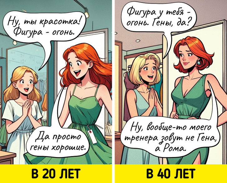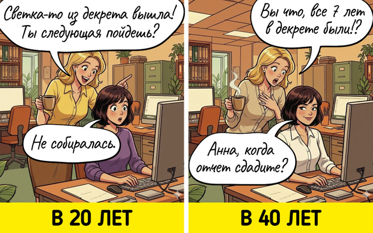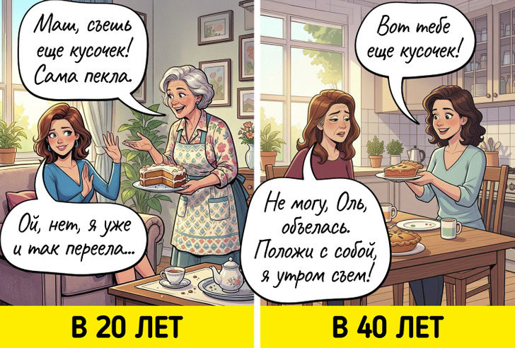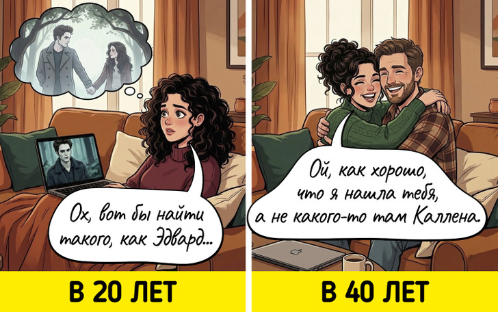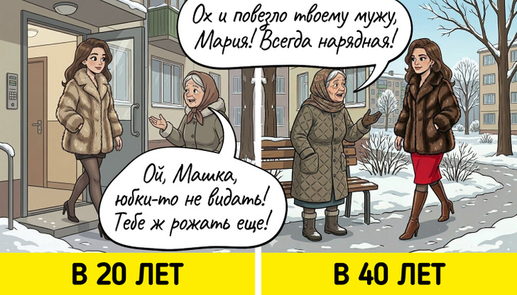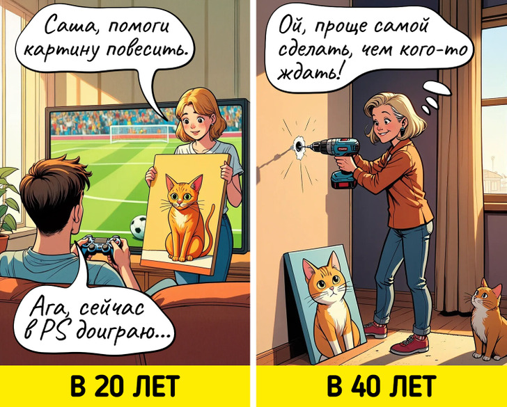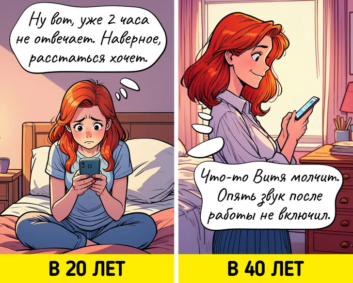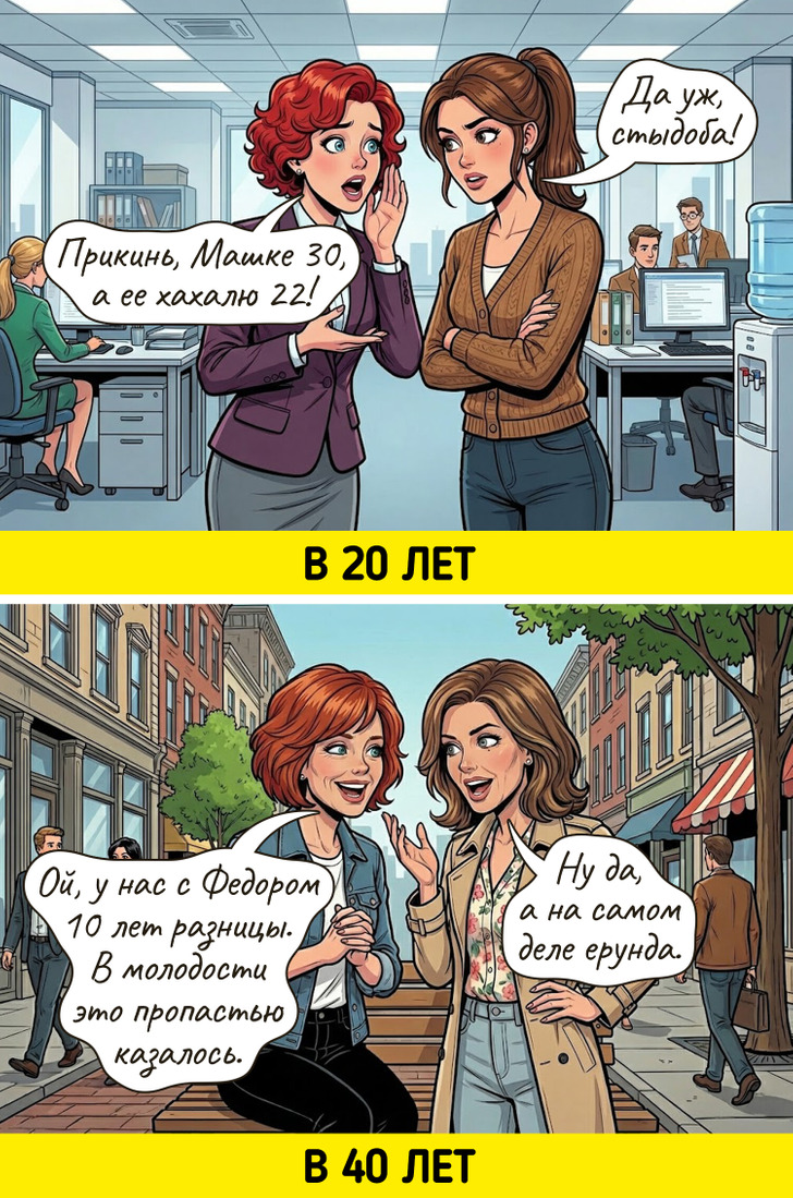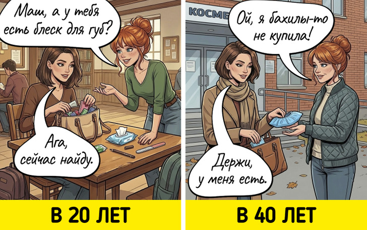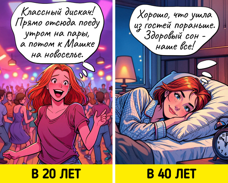 Каждый возраст прекрасен по-своему, и 40+ в том числе. Это время, когда комфортные кроссовки, здоровый сон и рутина радуют больше, чем тусовки и острые ощущения, а в сумочке всегда найдется все необходимое на любой случай жизни. Мы подготовили серию добрых и метких комиксов о том, как полярны наши приоритеты в 20 и в 40 лет.