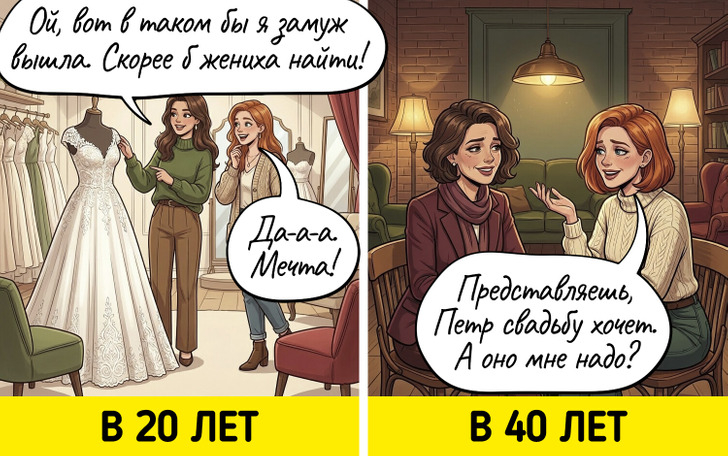 Отношение к браку в 20 лет и в 40 лет тоже абсолютно разное. Наряжаться в 40 лет в белое и играть шикарную свадьбу уже кажется лишним