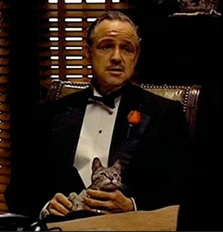Трудно поверить, но один из самых гипнотизирующих кадров в истории кинематографа — суровый Дон Корлеоне, нежно перебирающий шерсть пушистой кошки, — родился благодаря чистой импровизации. В сценарии и в романе никакой кошки не было — хвостатый сам пришел на кастинг. Он лениво прошмыгнул между софитами прямо перед съемкой первой сцены и попался на глаза Фрэнсису Форду Копполе. Режиссер тут же подхватил его и усадил пушистого наглеца на колени актеру.