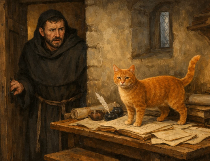 Где-то в 1420 году в уютном Девентере на просторах Нидерландов одному писцу пришлось срочно импровизировать из-за кошачьего каприза: пока монах спал, настырный кот забрался на стол и щедро пометил брошенную рукопись. Вместо того чтобы просто выбросить испорченный лист, удрученный писец превратил эту бытовую неприятность в мини-шедевр. Он оставил поверх приписку на латыни, в которой выбранил кота и предостерег коллег: не оставляйте работы без присмотра там, где по ночам хозяйничают коты. А также нарисовал забавную карикатуру на пушистого пакостника.