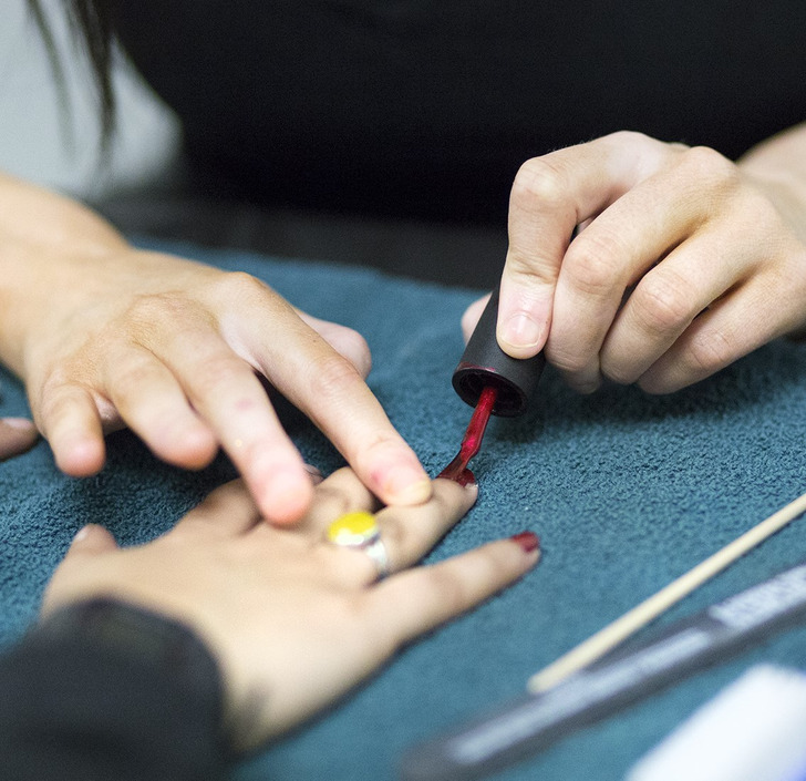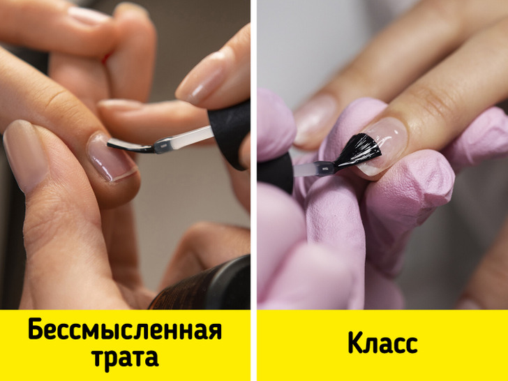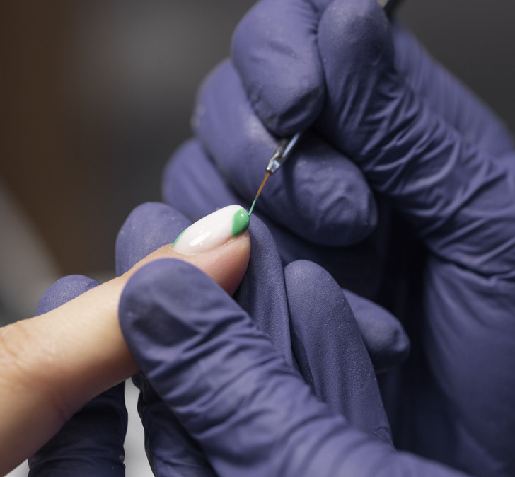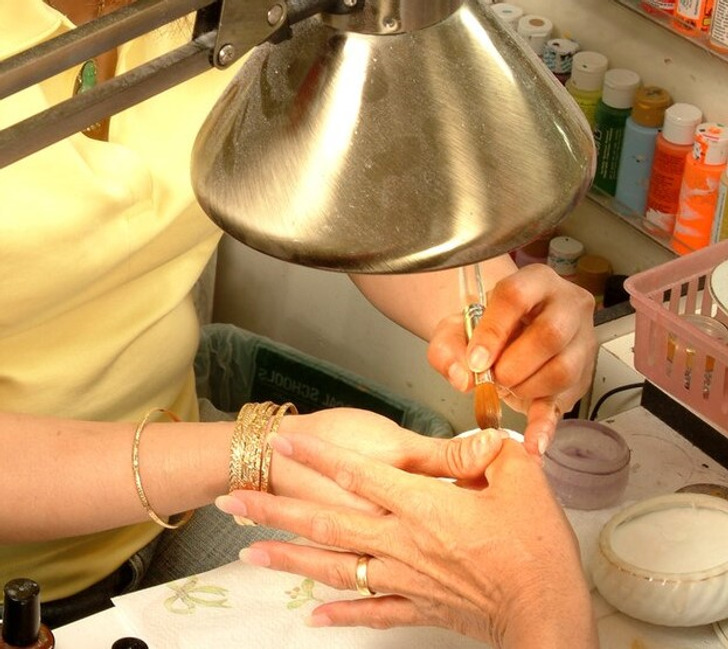 Кисти — один из самых важных инструментов для работы с акриловым покрытием и шеллаком. Если они сделаны из некачественных материалов или мастер плохо заботится об инструментах — не очищает их от пыли и оставляет под воздействием солнечных лучей, — значит, и к работе человек относится спустя рукава. А маникюр в результате получится не ахти каким. Другой настораживающий признак — наличие только крупных кисточек. Многие мастера любят их за то, что волокна удерживают больше средства, и в результате нанесение покрытия занимает меньше времени. Но из-за такого подхода лак зачастую попадает на кожу вокруг ногтя, что может вызвать раздражение.