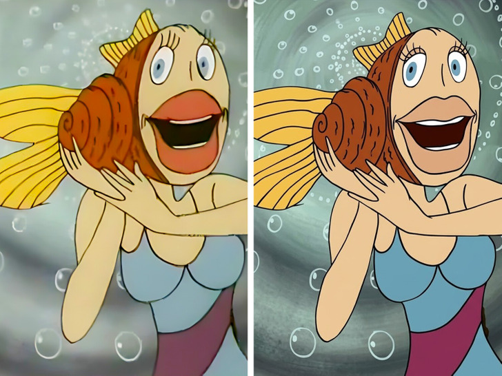Без своих плотных теней и резкого контраста на лице Русалочка внезапно превращается из меланхоличной героини в совсем юную девушку с прозрачным, почти детским взглядом, и она уже не кажется гостьей из печальной легенды.
