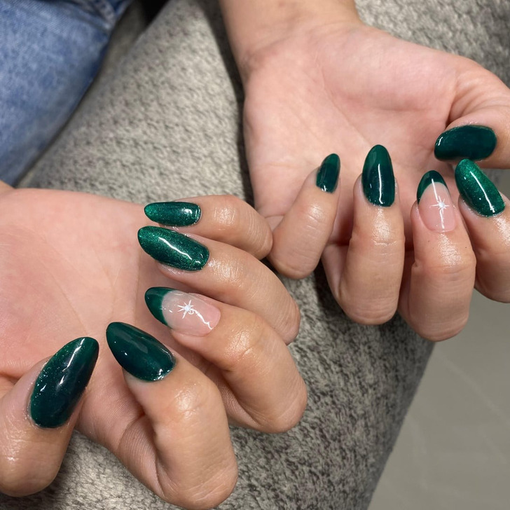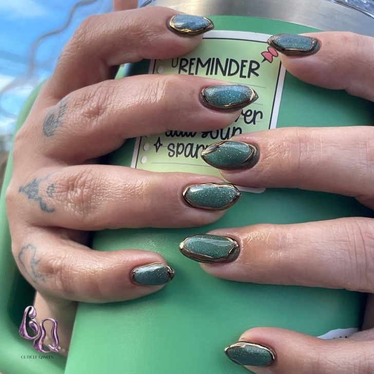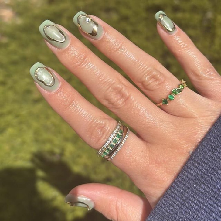 Для любителей зеленого эксперты предлагает морозный оттенок. Легкий холодный перламутр отдает блеском, что делает этот дизайн отличным вариантом на зиму. Автор статьи попробовала тренд на себе и получила уйму комплиментов, один из которых ярко описывает реакцию при виде этого дизайна: «Отвал башки!»